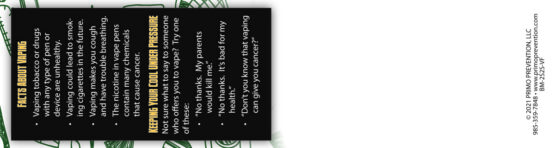 These bright, colorful 2″ x 8″ bookmarks encourage children to be “2 Smart 2 Start” Vaping and be Vape Free 4-Ever.