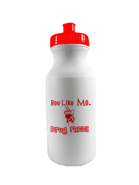 White 20 oz. water bottle imprinted in red.
