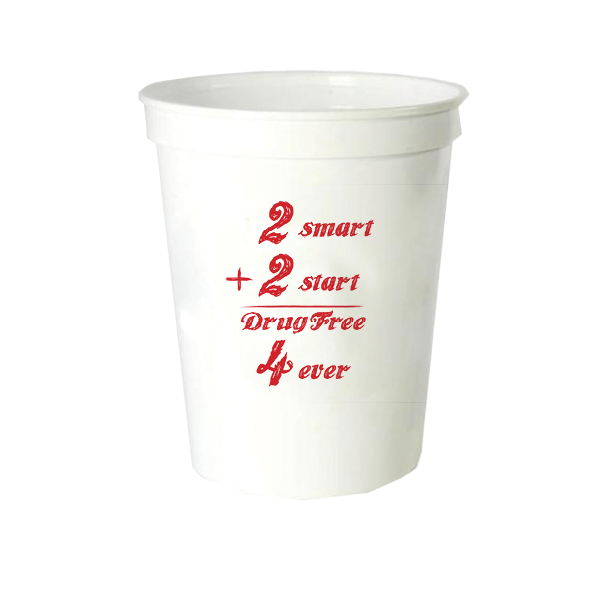 White 16 ounce stadium cups with the Drug Prevention Month message “2 Smart 2 Start: Drug Free 4 Ever!” in red imprint.
