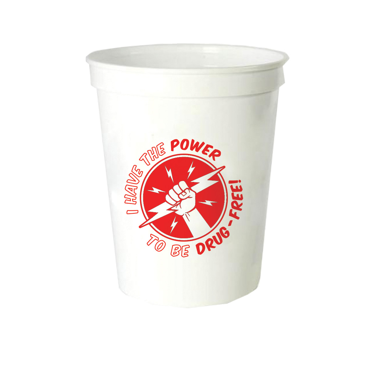 White 16 ounce stadium cups with the Drug Prevention Month message “I Have the Power To Be Drug Free” in red imprint.