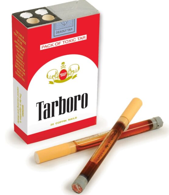 This realistic display contains two removable cigarettes filled with gooey, simulated tar, which represents the amount of toxic tar that a smoker receives from smoking one pack of cigarettes. Realistic cigarette package packs a powerful impression.