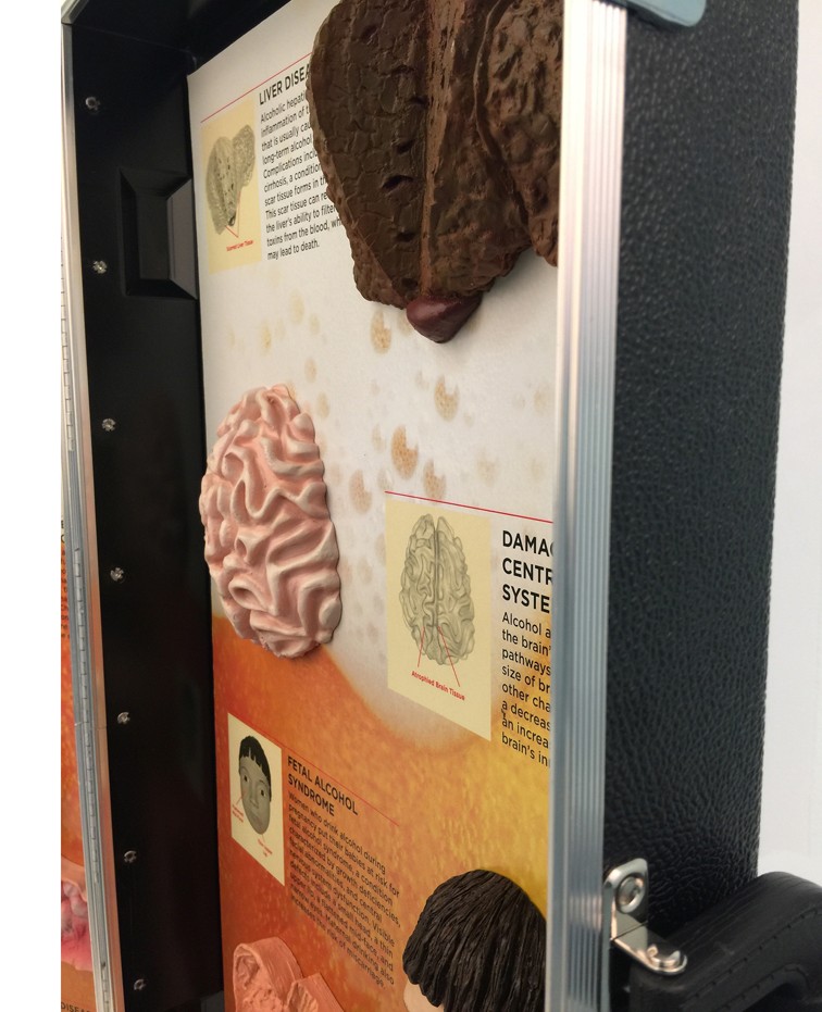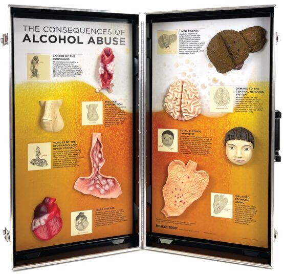 With permanently mounted, handpainted models of liver disease, heart disease, cancer of the esophagus, and more, this display (28″ x 27″) is perfect for highlighting a few of the many ways alcohol abuse ravages the body.