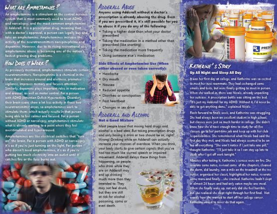 This pamphlet discusses the side effects of abusing these drugs, such as Adderall. It also discusses how mixing these drugs with other drugs or alcohol can make for a deadly combination.