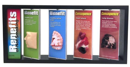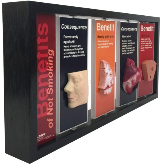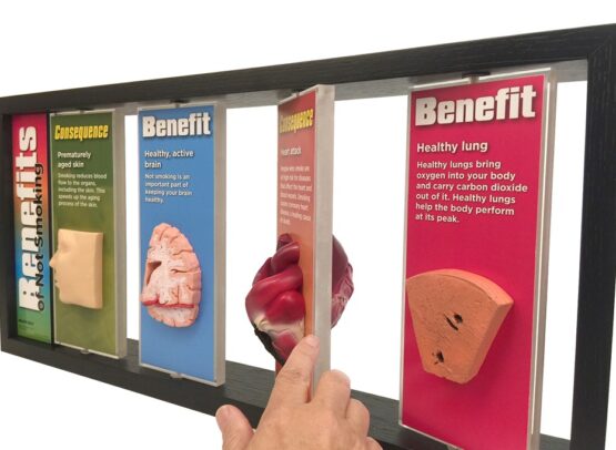 Show everyone four great benefits of not smoking with this interactive display (24½” x 12″ x 3″), which makes a great tabletop display or can be mounted on a wall.