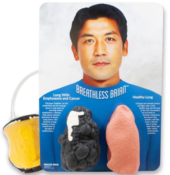 Smoking is guaranteed to harm health, but it may take awhile to understand what damage is occurring inside the body. This convenient lung comparison model is the perfect way to take an inside look. Although one of Breathless Brian’s lungs is smooth and pink—representing the healthy lungs of someone who is smoke-free and avoids secondhand smoke—Breathless Brian’s other lung, which has been destroyed by emphysema and cancer, sadly looks more like melted plastic than human tissue.
