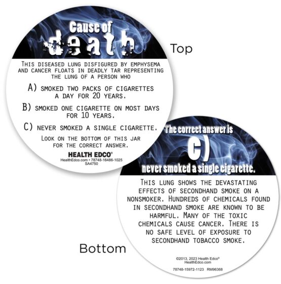 This surprising “postmortem” lung model shows that secondhand smoke can be an indiscriminate killer, infiltrating and damaging nonsmokers’ lungs just as it does those of a smoker. Display features explanatory top and bottom labels that explain that there is no safe level of exposure to secondhand smoke. 5″ x 7″.