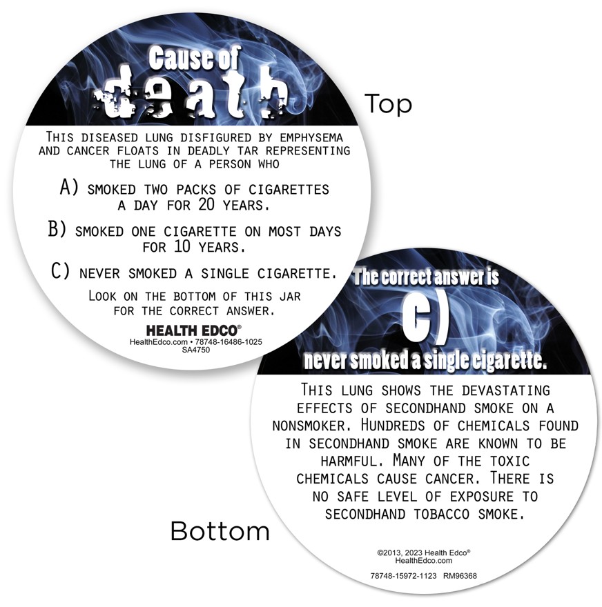 This surprising “postmortem” lung model shows that secondhand smoke can be an indiscriminate killer, infiltrating and damaging nonsmokers’ lungs just as it does those of a smoker. Display features explanatory top and bottom labels that explain that there is no safe level of exposure to secondhand smoke. 5″ x 7″.