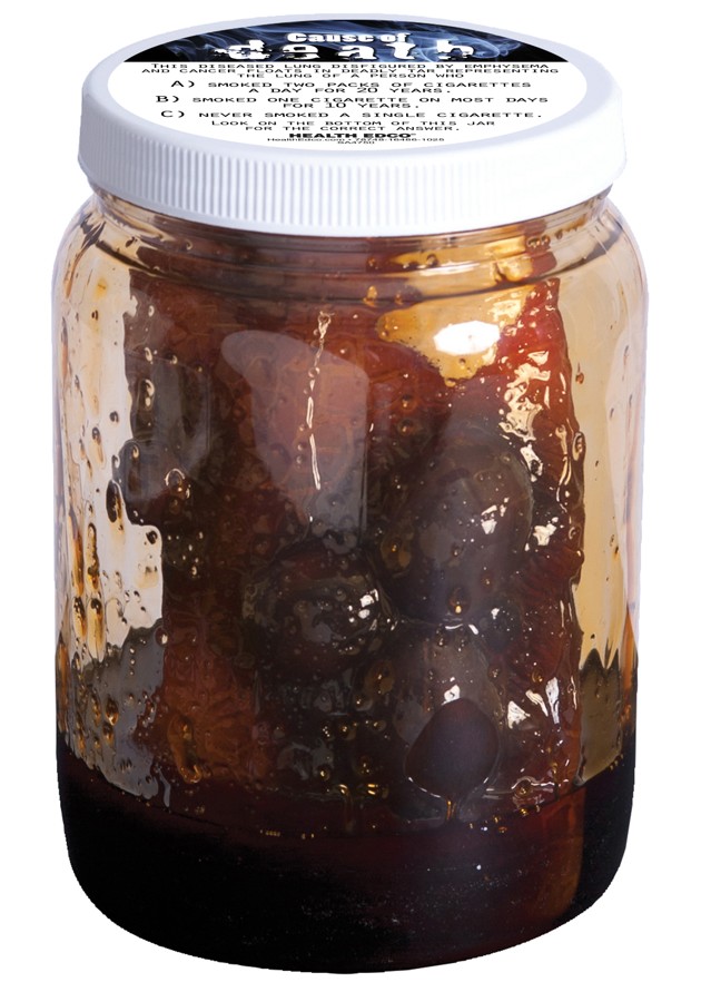 Reveal the dangers of secondhand smoke with this startling display, which features a tumor-infested lung bathed in oozing brown tar.