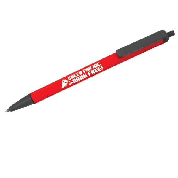 Red click pen imprinted with the Drug Prevention Month message “Cheer for Me, I Am Drug Free” in white.