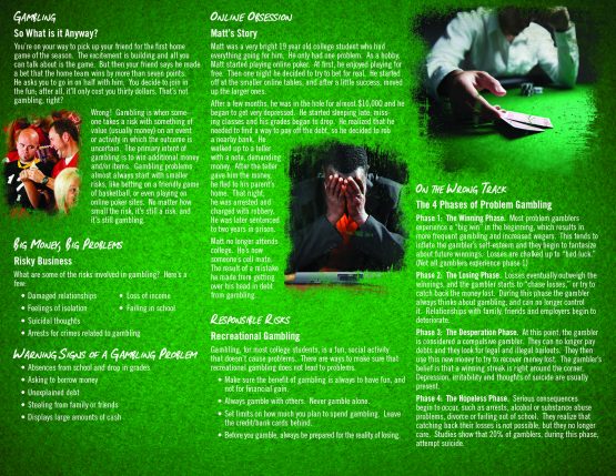 This pamphlet informs the reader about patholgical gambling, the warning signs of gambling and even gives tips on how to gamble responsibly. It also includes an official questionare from Gamblers Anonymous on how to tell if you are a compulsive gambler.