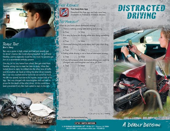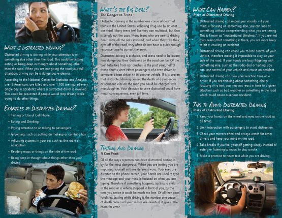 Distracted driving is quickly becoming one of this country’s biggest on road problems. This pamphlet offers tips to avoid driving distracted and also a free app called Text Guardian, that can be installed on teen’s phones and stops them from using their phones while driving.