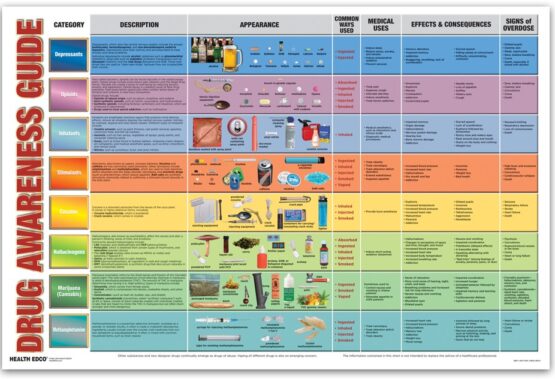 The chart explains what each drug is, how it’s used, the drug’s effects, and possible signs of overdose. Easy-to-understand text is reinforced with photos of more than 60 different substances and types of paraphernalia. Laminated. 36″ x 24″.