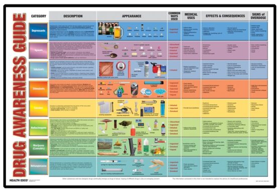 The guide explains what each drug is, how it’s used, the drug’s effects, and possible signs of overdose. Easy-to-understand text is reinforced with photos of more than 60 different substances and types of paraphernalia. Includes built-in easel for tabletop display. 36″ x 24″.