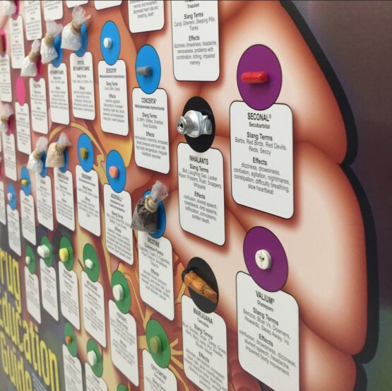From opioid painkillers to stimulants, depressants, and hallucinogens, this Plexiglas-covered guide features realistic facsimiles of more than 40 illegal and prescription drugs.
