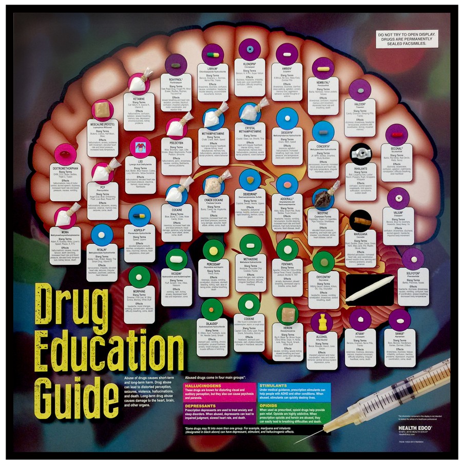 From opioid painkillers to stimulants, depressants, and hallucinogens, this Plexiglas-covered guide features realistic facsimiles of more than 40 illegal and prescription drugs.