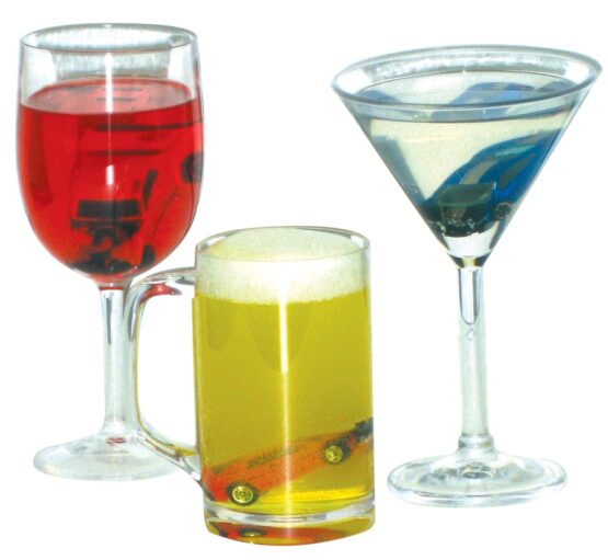 Reinforce the fact that drinking and driving often ends in catastrophe with these plastic beer, wine, and martini glasses that each contains a smashed car inside. Perfect as a discussion starter for any alcohol abuse prevention program.