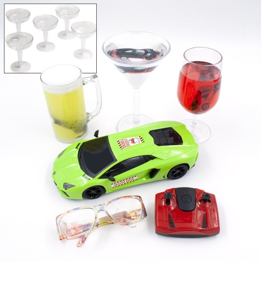 Drunk & Dangerous Remote Control Car—Let participants “drive” a car while wearing the glasses. They will quickly learn that left seems like right, and even keeping the car straight is nearly impossible—exactly like trying to drive a real car while intoxicated. Plastic champagne-glass pylons are provided to help set up a road course. Note: Model, color, and appearance of car may vary.