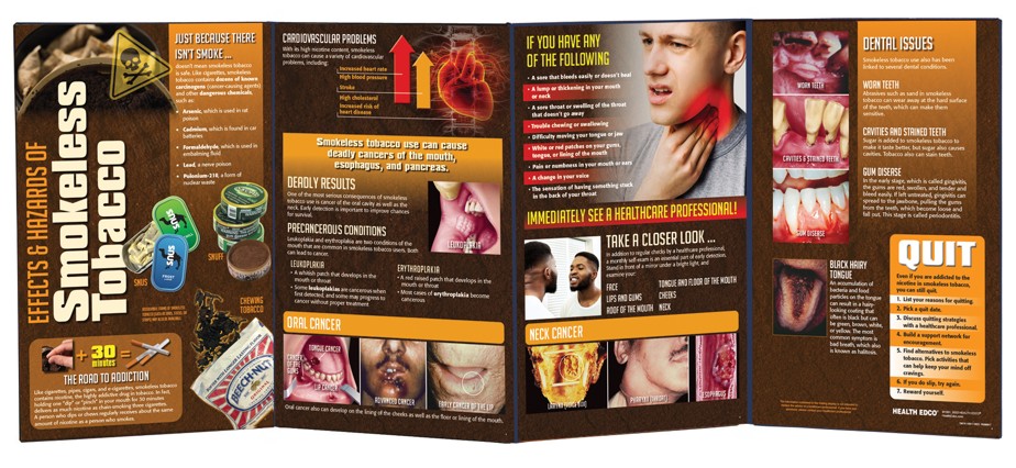 From toxic chemicals to nicotine addiction, cardiovascular damage, dental devastation, and oral and neck cancers, this eye-popping folding display (58″ x 22½” opened) covers the dangers of using smokeless tobacco.