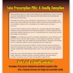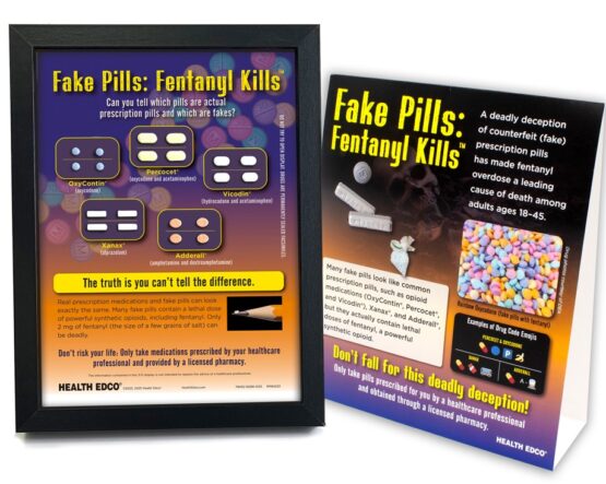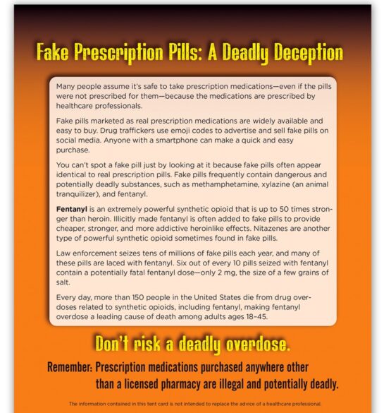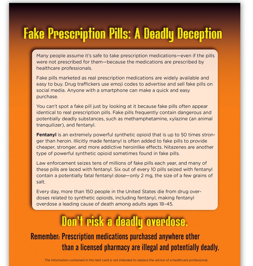 Realistic pill models (pill fronts and backs) include facsimiles of the commonly abused attention-deficit/hyperactivity disorder (ADHD) drug Adderall and the benzodiazepine Xanax commonly prescribed for anxiety disorders, as well as opioid drugs OxyContin, Percocet, and Vicodin. The 3-D display includes a built-in easel back allowing it to stand on any tabletop. Accompanying, two-sided tent card explains that fake pills often contain potentially deadly substances, such as xylazine (an animal tranquilizer) and powerful synthetic opioids, such as nitazenes and fentanyl. It also covers the dangers of deadly fentanyl overdose and urges viewers only to take prescription medications obtained through a licensed pharmacy and prescribed for them by a healthcare professional.