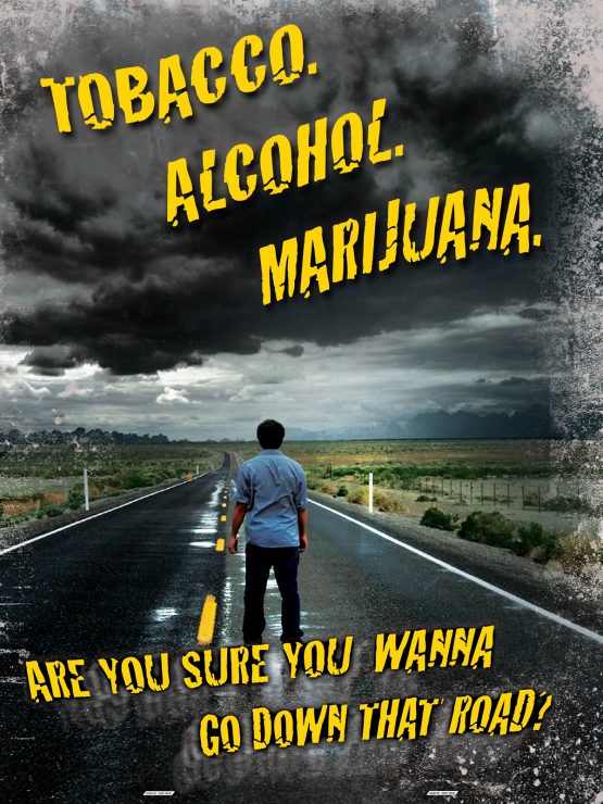 This dark, twisted poster sends a message to your target audience. The message, “Using Tobacco, Alcohol or Marijuana will lead you down the wrong road”.