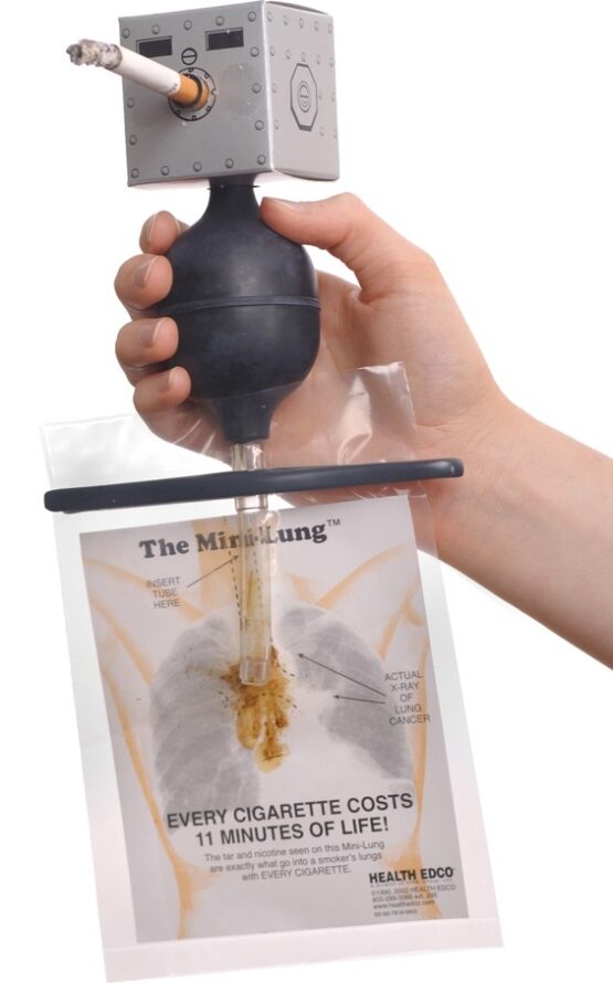 Small but creating a powerful message, this hand-held model actually smokes a real cigarette (not included) and collects tar on a photo of a real chest X-ray of a lung cancer patient. Stained prints fit into plastic bags, keeping stains intact when they are passed around for closer inspection.