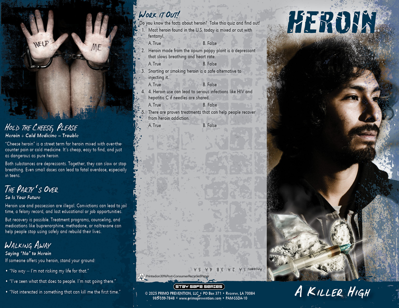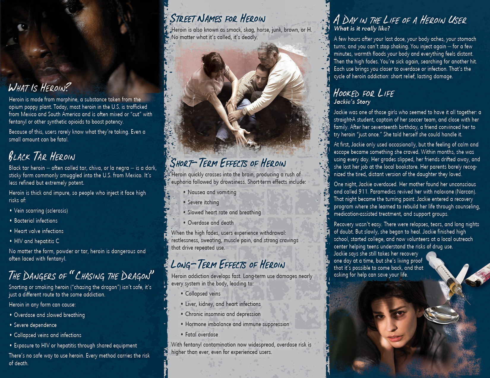 There are three major long term effects of heroin: addiction, withdrawal and death. This pamphlet explains the dangers of not only “shooting up”, but smoking, snorting and even putting it into liquid eye drops as well.