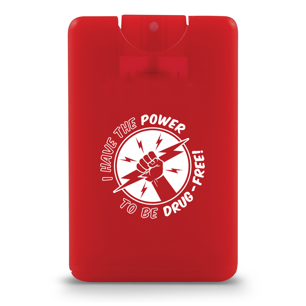 These translucent plastic credit card sized hand sanitizer sprays are red with white imprint that says “I Have the Power to Be Drug Free”. 62% Alcohol Content. 20ml.