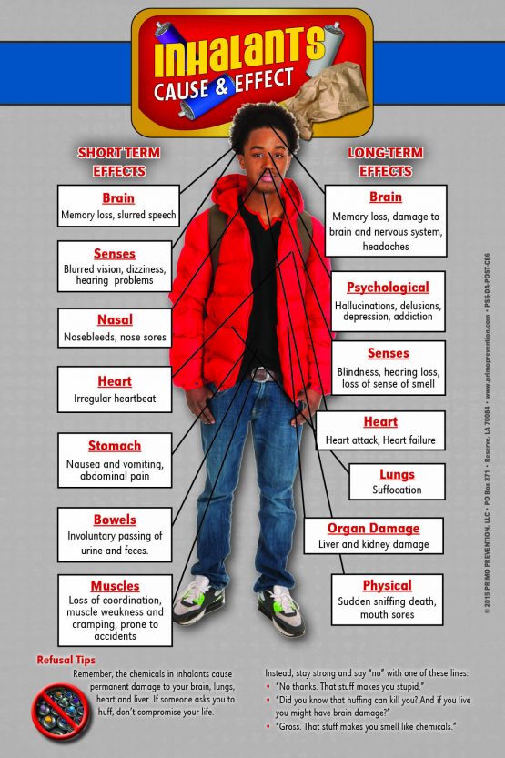 This Cause & Effect Mini Poster helps educate others on the effects that Inhalants have on the body & mind. Also includes refusal tips for teens.