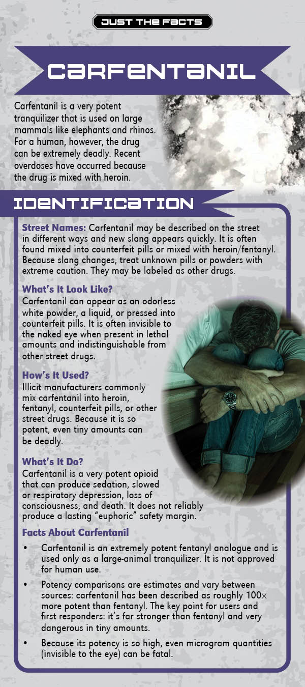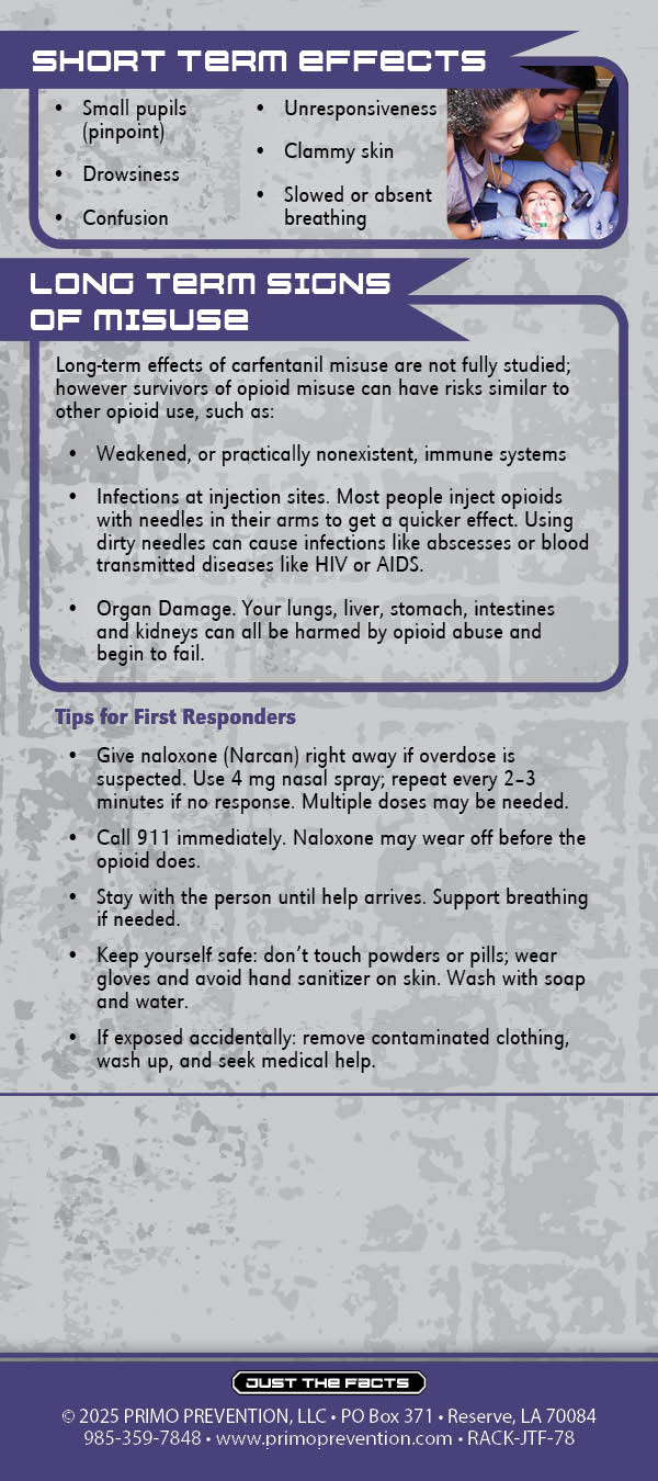 This rack card is a quick reference for anyone wanting to know the facts about the tranquilizer Carfentanil, like: