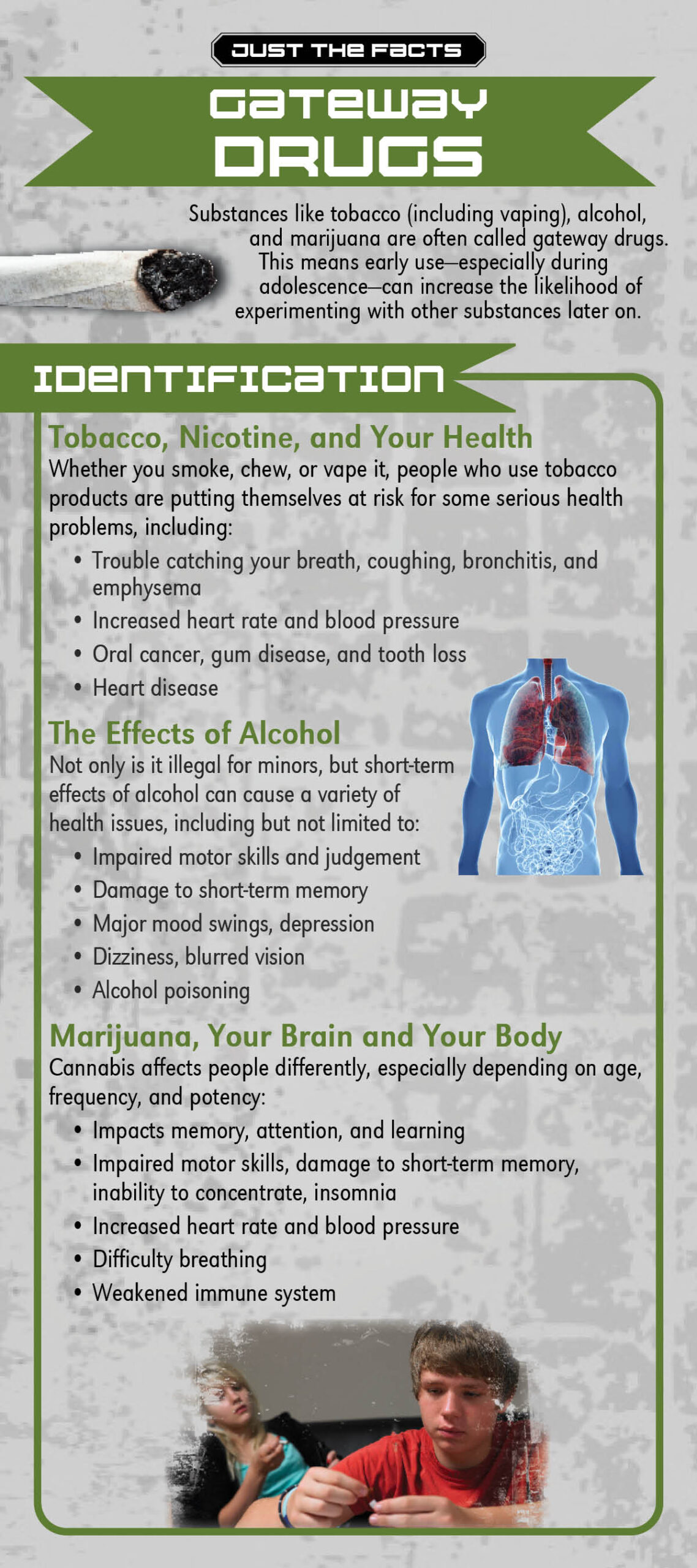 What are gateway drugs? This rack card will teach you short and long term effects of drugs like Alcohol, Tobacco & Marijuana. Also learn how these drugs can affect your physical and mental health and gives you some ways to “Say No” to Gateway Drugs!