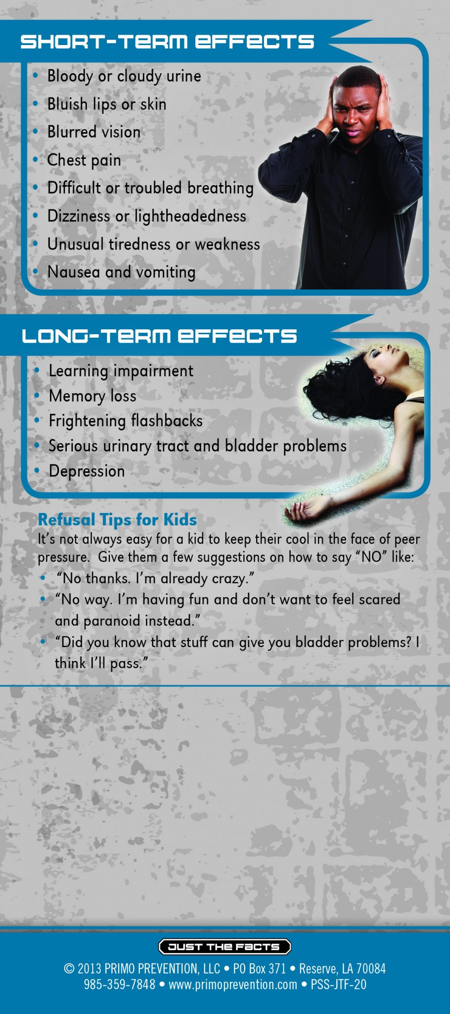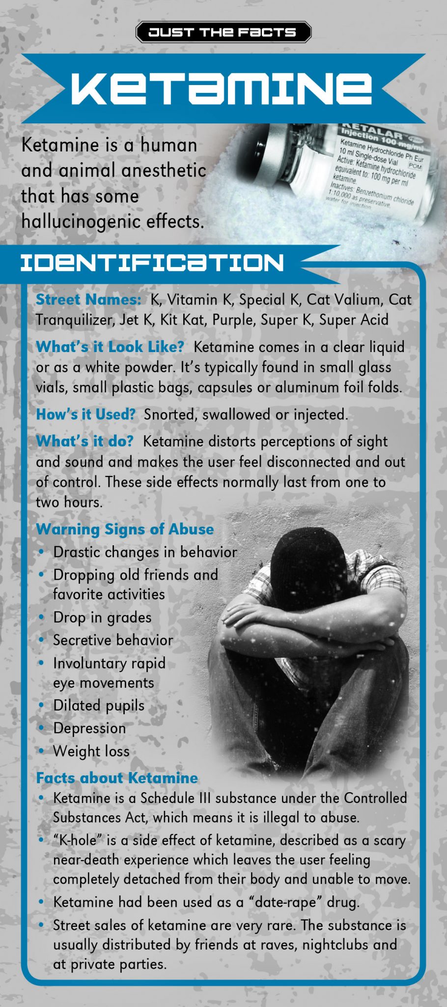 Ketamine can cause something called “K-hole”, a near death experience that leaves the user feeling completely detached from their body and unable to move. This rack card is a quick reference for anyone wanting to know the facts about Ketamine, like: