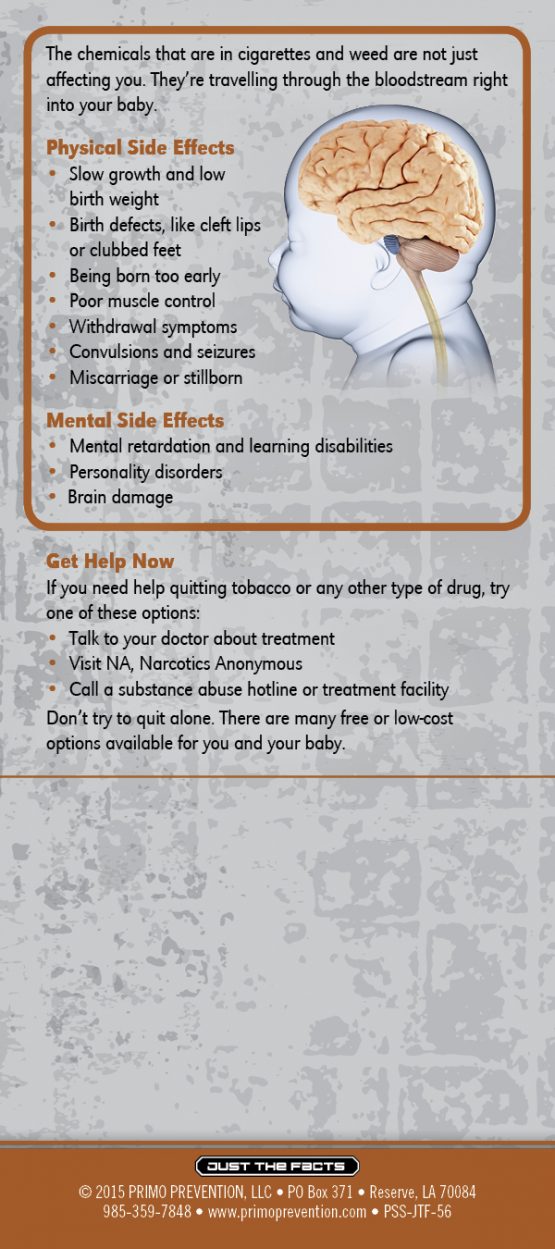 This rack card is a quick reference for anyone wanting to know the facts about smoking cigarettes or marijuana while pregnant.