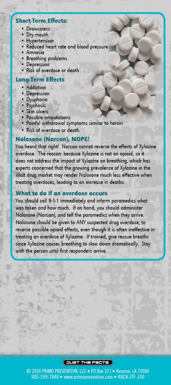 This rack card discusses how Xylazine is often mixed with several other deadly drugs, such as Fentanyl, Cocaine & Heroin, increasing the risk for overdose.