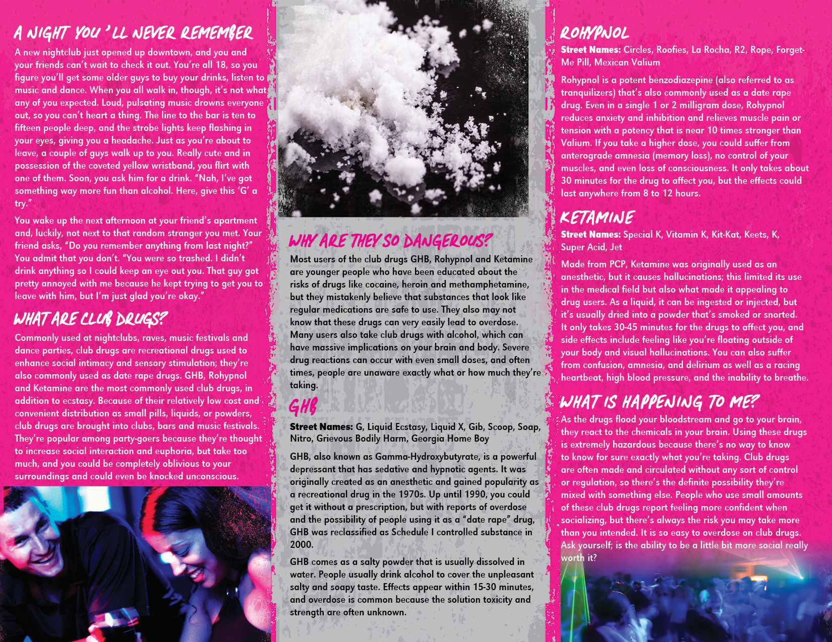 Learn about the dangers of “party drugs” such as GHB, Rohypnol and Ketamine, and how trying these, even one time, can turn your party into a nightmare.