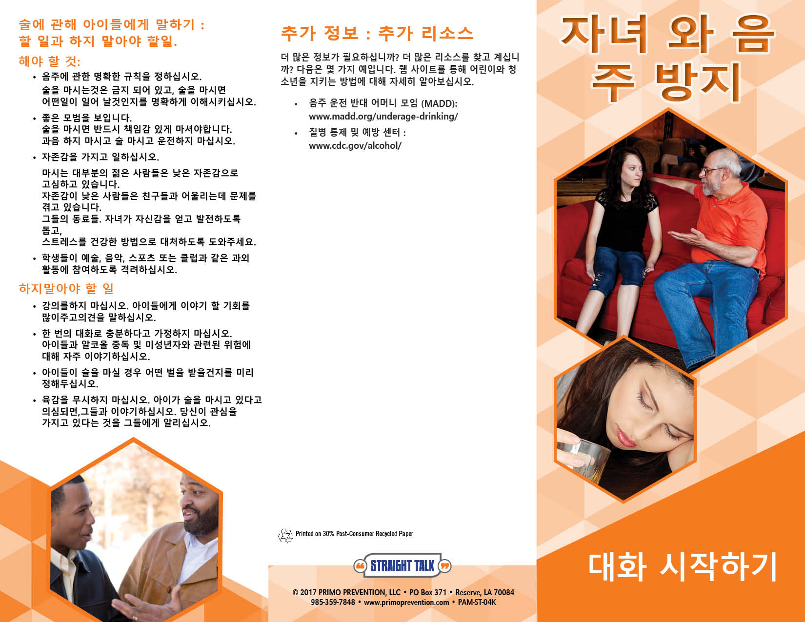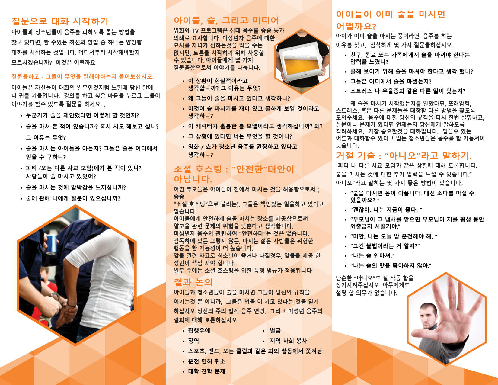 Topics discussed are: asking questions, listening and being patient instead of reacting, tips for do’s and don’ts, help with refusal skills, consequences of drinking, media influence and what to do if a child is already drinking.