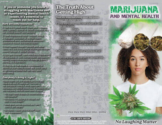 This pamphlet shows the reader what marijuana is, street names, statistics and how mental health can be affected by marijuana use.
