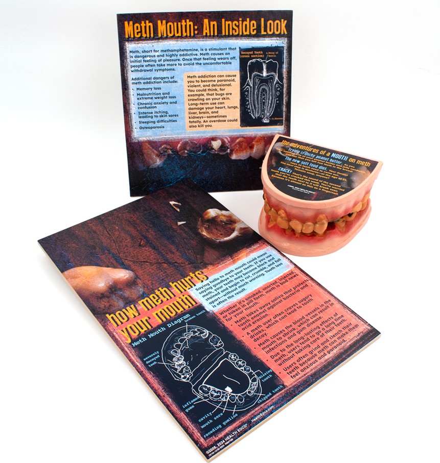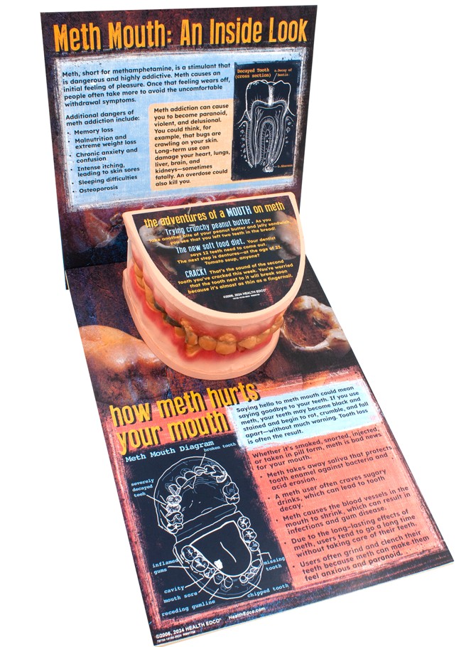 Graphically depicting the grisly effects of methamphetamine on the mouth, this giant mouth display is ideal for schools, law enforcement agencies, and other organizations looking to give teens and young adults compelling reasons to stay away from meth.
