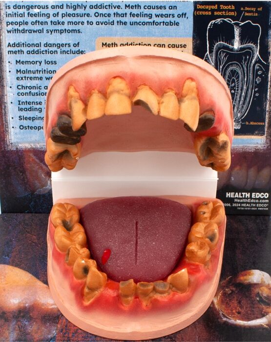 The 3-D, handpainted mouth model shows the oral consequences of meth use, such as missing teeth, severely decayed teeth, broken teeth, receding gums, and more. Also includes a tongue model with an ulcer.