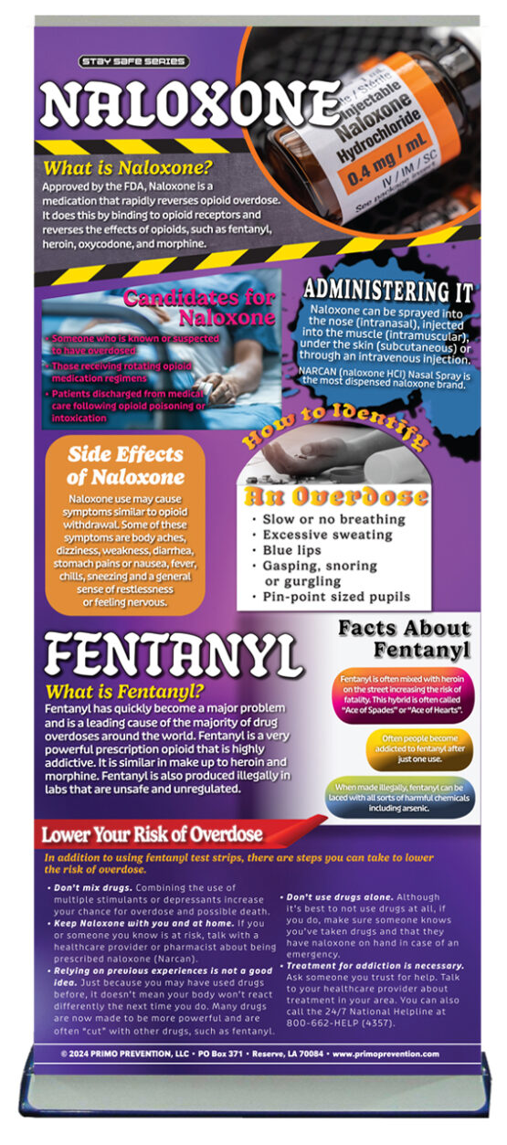 Portable, eye-catching, and professional. Use this colorful retractable banner to educate others on the dangers of using Fentanyl and when/how to use Naloxone.