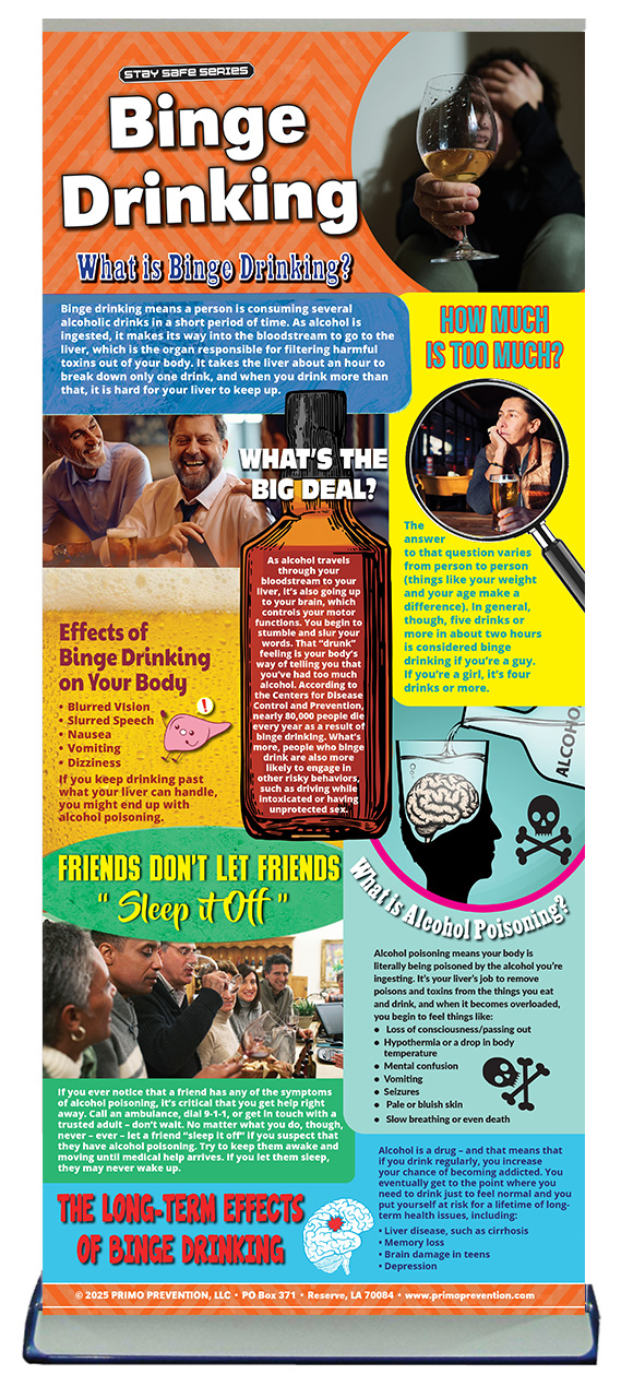 Portable, eye-catching, and professional. Use this colorful retractable banner to help educate others on the dangers of binge drinking.