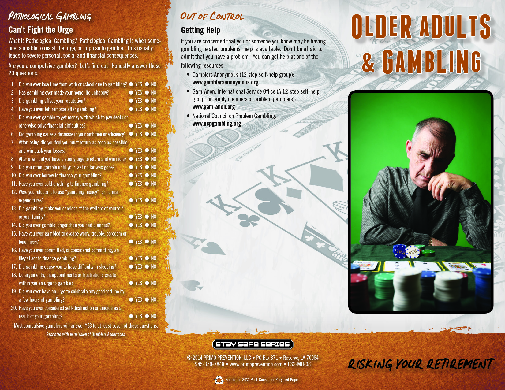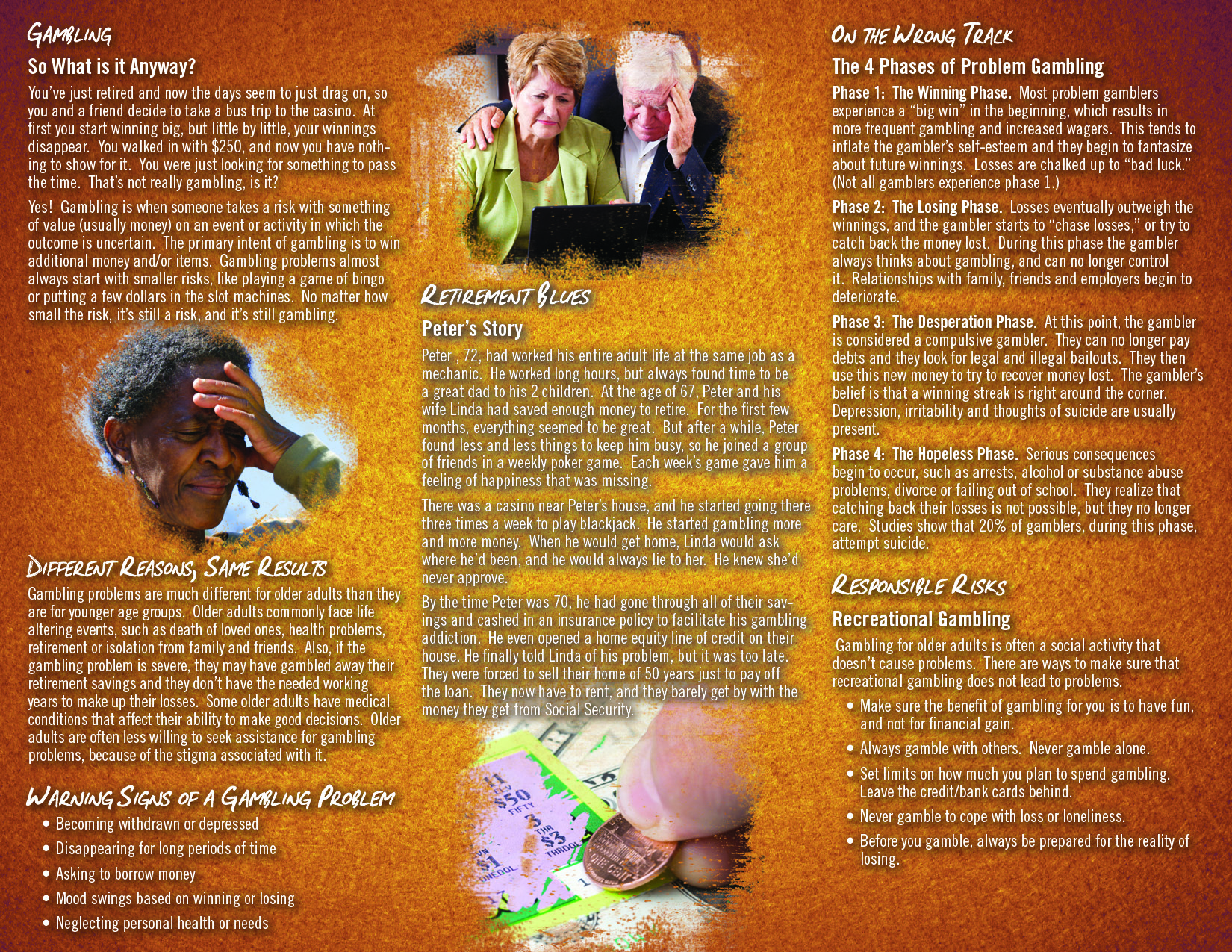 Learn how gambling problems are much different for older adults than it is for younger age groups. This pamphlet informs the reader about patholgical gambling, the warning signs of gambling and even gives tips on how to gamble responsibly. It includes an official questionare from Gamblers Anonymous on how to tell if you are a compulsive gambler. It’s also printed in a larger font than our other pamphlets, so it’s easier for the older adults to read.