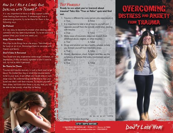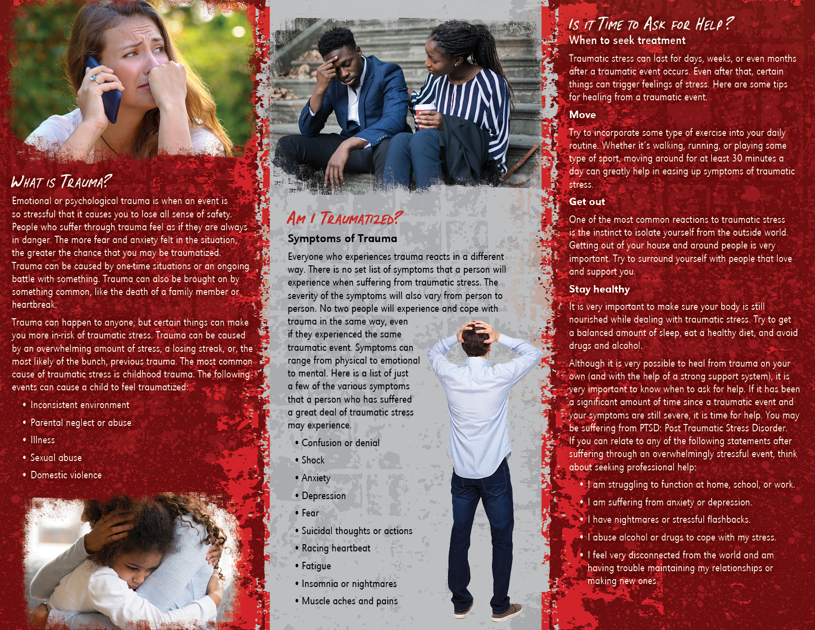 This pamphlet teaches readers some symptoms of trauma, how to get help and how to help a loved one who’s dealing with Trauma.