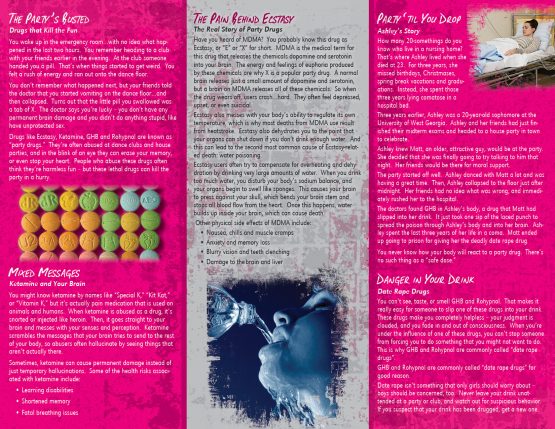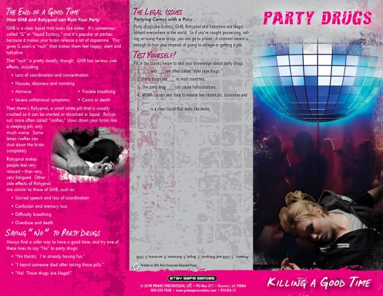 Learn about the dangers of “party drugs” such as Ecstasy, GHB, Rohypnol and Ketamine, and how trying these, even one time, can turn your party into a nightmare.