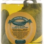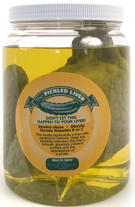 Inside this sealed plastic specimen jar (4½” x 7½”), a lifelike BIOLIKE 2™ model of a cirrhotic liver floats beside a model of a pickle.