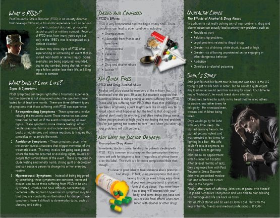 This pamphlet discusses the symptoms of PTSD, warning signs, prevention, facts and finding support.