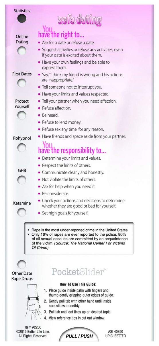 This Pocket Slider outlines the important elements to maintain a healthy relationship, with tips to avoid bad relationships, end abusive relationships, and stay safe after a relationship ends.