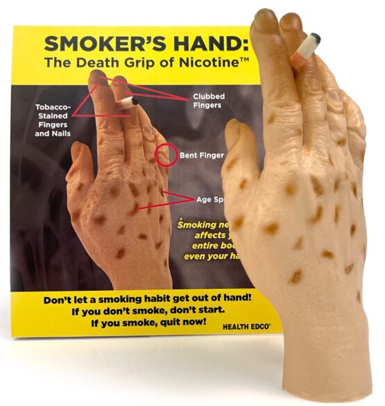 Demanding attention, this haunting, utterly realistic hand model (4″ x 9½” x 3″) shows viewers how smoking can affect their hands.