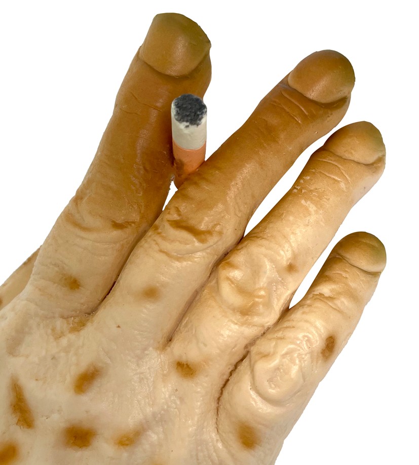 Demanding attention, this haunting, utterly realistic hand model (4″ x 9½” x 3″) shows viewers how smoking can affect their hands.
