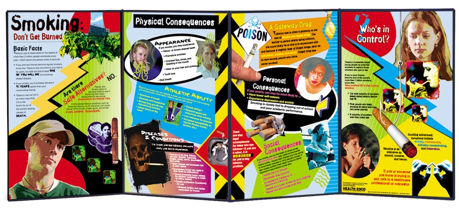 Designed for a teen audience, this folding display explains why the wise choice is not to smoke. Covers the physical, personal, and social consequences of smoking, including its negative effects on physical appearance. Also explains that alternatives, such as cigars and smokeless tobacco, are not safe alternatives, and that nicotine is a highly addictive drug. 58″ x 22½” opened.
