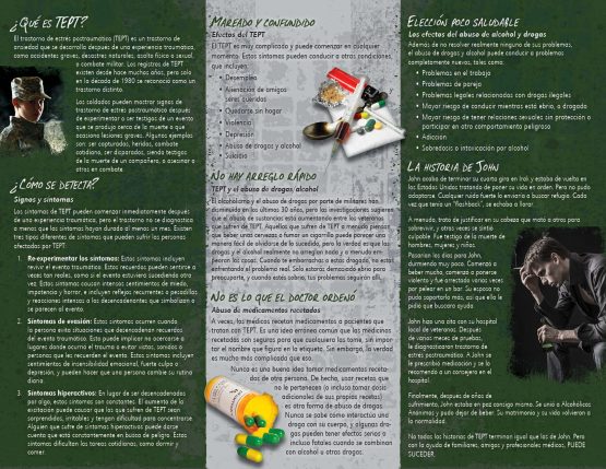 This pamphlet discusses the symptoms of PTSD, warning signs, prevention, facts and finding support.
